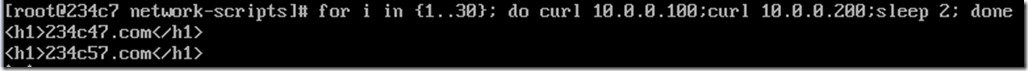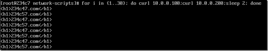 [root@234c37 ~]# ipvsadm -Ln IP Virtual Server version 1.2.1 (size=4096) Prot LocalAddress:Port Scheduler Flags -> RemoteAddress:Port Forward Weight ActiveConn InActConn TCP 10.0.0.100:80 wrr -> 192.168.234.47:80 Route 1 0 21 TCP 10.0.0.200:80 wrr -> 192.168.234.57:80 Route 1 0 39