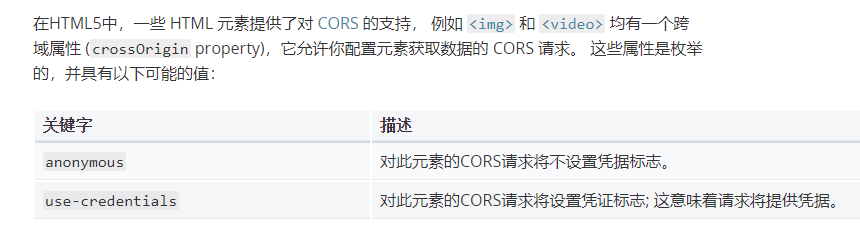 查閱MDN文檔(https://developer.mozilla.org/zh-CN/docs/Web/HTML/CORS_settings_attributes),可以發(fā)現(xiàn)crossOrigin有兩個取值