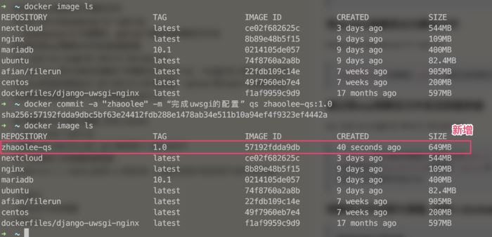 docker commit -a "zhaoolee" -m “完成uwsgi的配置” qs zhaoolee-qs:1.0