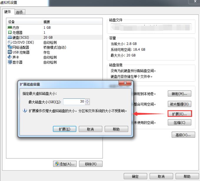 2. 增加磁盤空間,例如下圖使用VM虛擬機(jī)增加的方式。