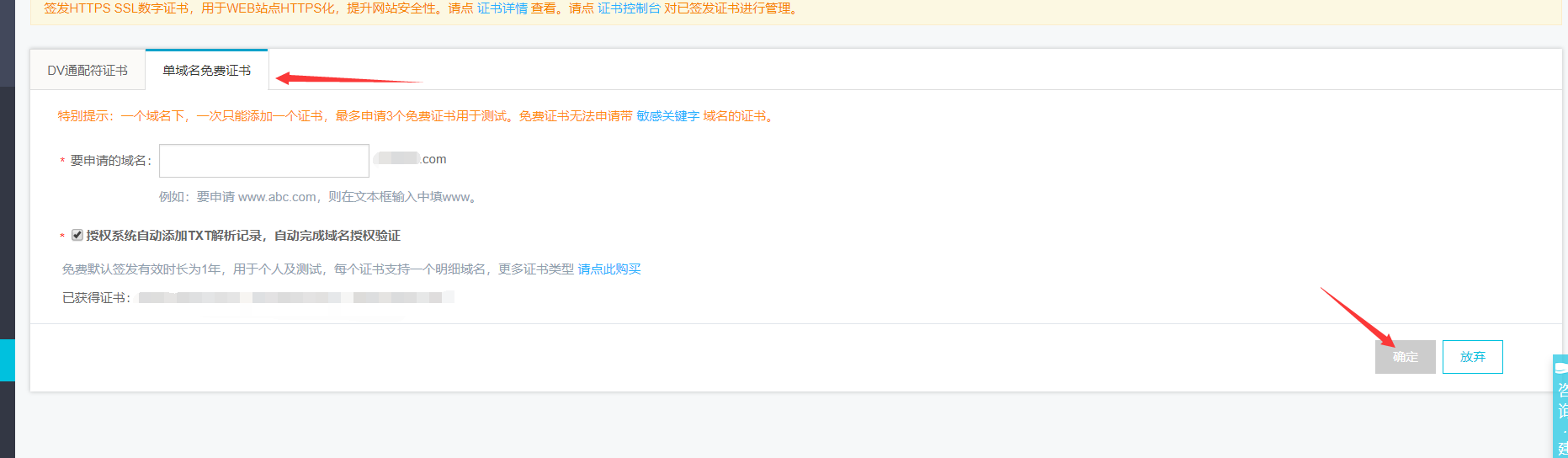 2.這里我申請的是免費(fèi)的單域名證書,點(diǎn)擊確定提交阿里云審核,大概10-20分鐘左右就審核好了