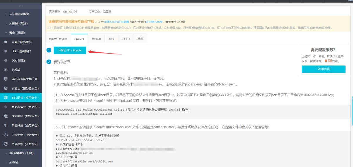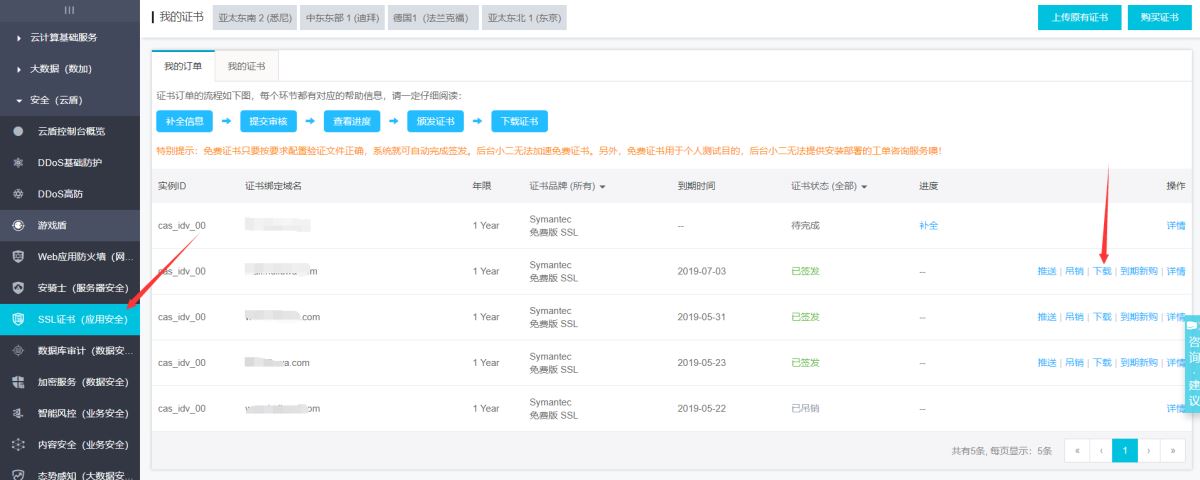 3.點(diǎn)擊左邊的菜單,選擇要配置的域名相應(yīng)的證書,點(diǎn)擊后面的下載