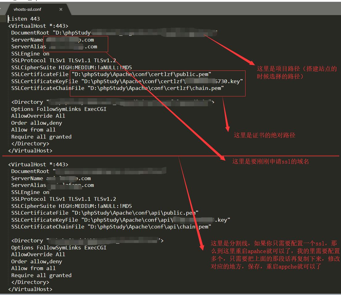 Listen 443 <VirtualHost *:443> DocumentRoot "這里改為你項(xiàng)目的絕對路徑" ServerName 這里改為你要配置的域名 ServerAlias 這里改為你要配置的域名 SSLEngine on SSLProtocol TLSv1 TLSv1.1 TLSv1.2 SSLCipherSuite HIGH:MEDIUM:!aNULL:!MD5 SSLCertificateFile "這里改為你公鑰的絕對路徑" SSLCertificateKeyFile "這里改為你私鑰的絕對路徑" SSLCertificateChainFile "這里改為你證書鏈的絕對路徑" <Directory "這里改為你項(xiàng)目的絕對路徑"> Options FollowSymLinks ExecCGI AllowOverride All Order allow,deny Allow from all Require all granted </Directory> </VirtualHost> <VirtualHost *:443> DocumentRoot "這里改為你項(xiàng)目的絕對路徑 ServerName 這里改為你要配置的域名 ServerAlias 這里改為你要配置的域名 SSLEngine on SSLProtocol TLSv1 TLSv1.1 TLSv1.2 SSLCipherSuite HIGH:MEDIUM:!aNULL:!MD5 SSLCertificateFile "這里改為你公鑰的絕對路徑" SSLCertificateKeyFile "這里改為你私鑰的絕對路徑" SSLCertificateChainFile "這里改為你證書鏈的絕對路徑" <Directory "這里改為你項(xiàng)目的絕對路徑"> Options FollowSymLinks ExecCGI AllowOverride All Order allow,deny Allow from all Require all granted </Directory> </VirtualHost>