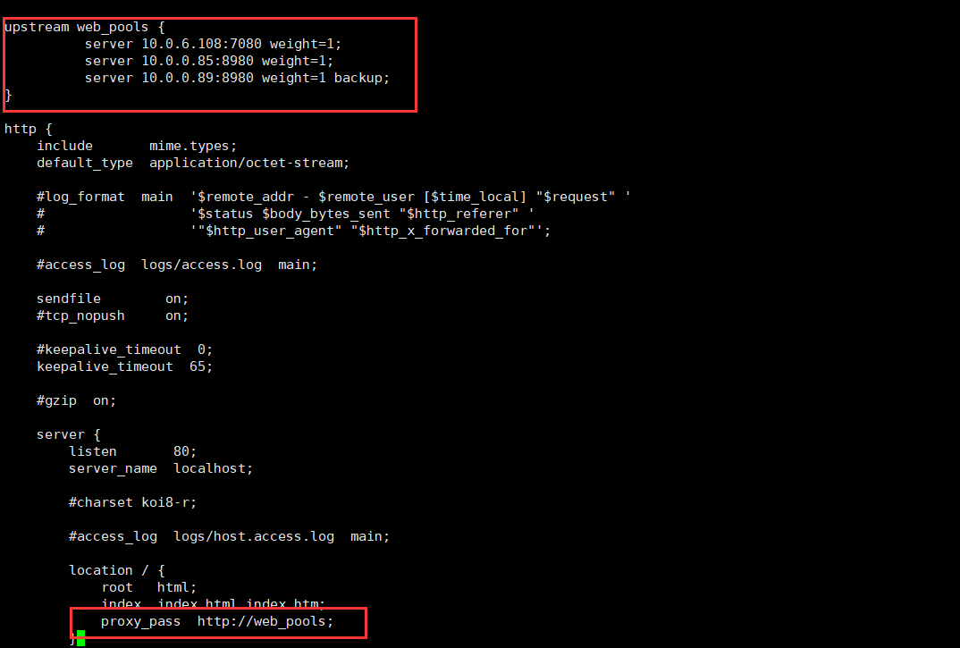 其中 weight是權(quán)重 backup是備用服務(wù)器 ,只有其它服務(wù)器宕機(jī)后,備用服務(wù)器才會啟動。