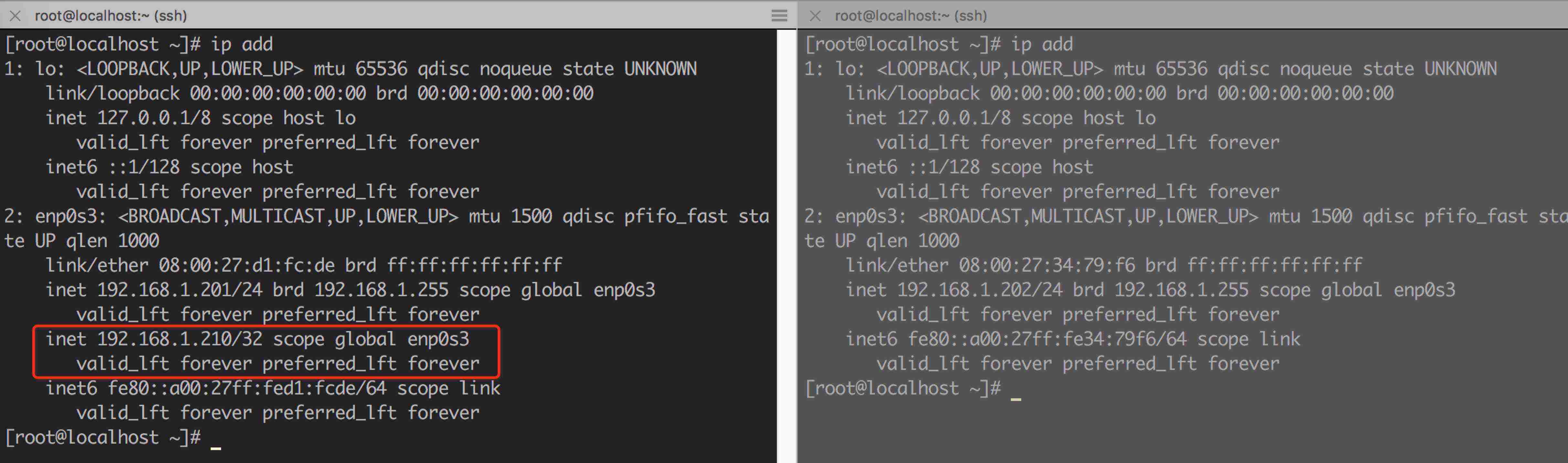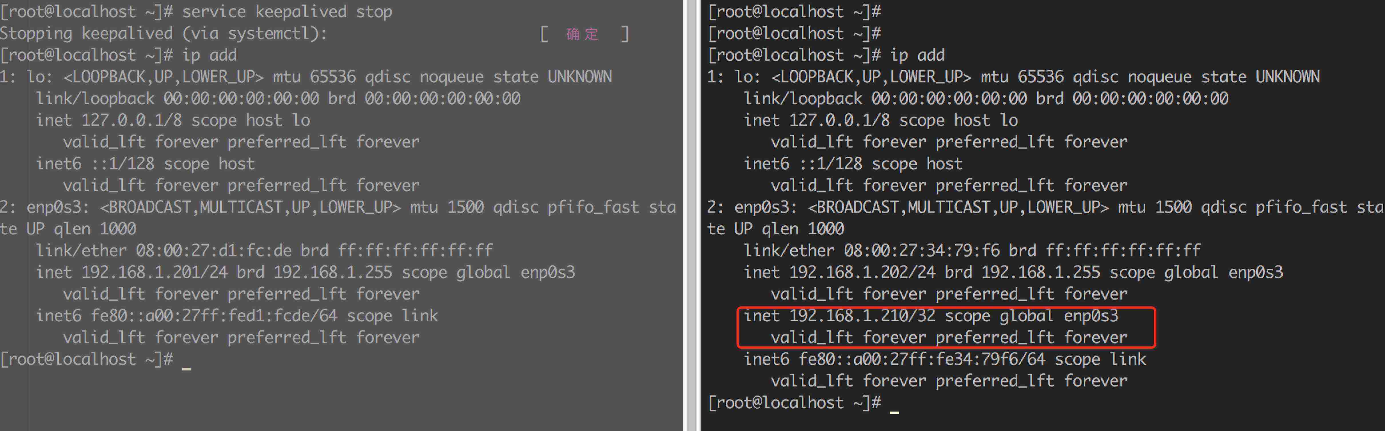 從上圖可以看出,vip地址192.168.1.210綁定在MASTER(192.168.1.201)的enp0s3網(wǎng)卡上。