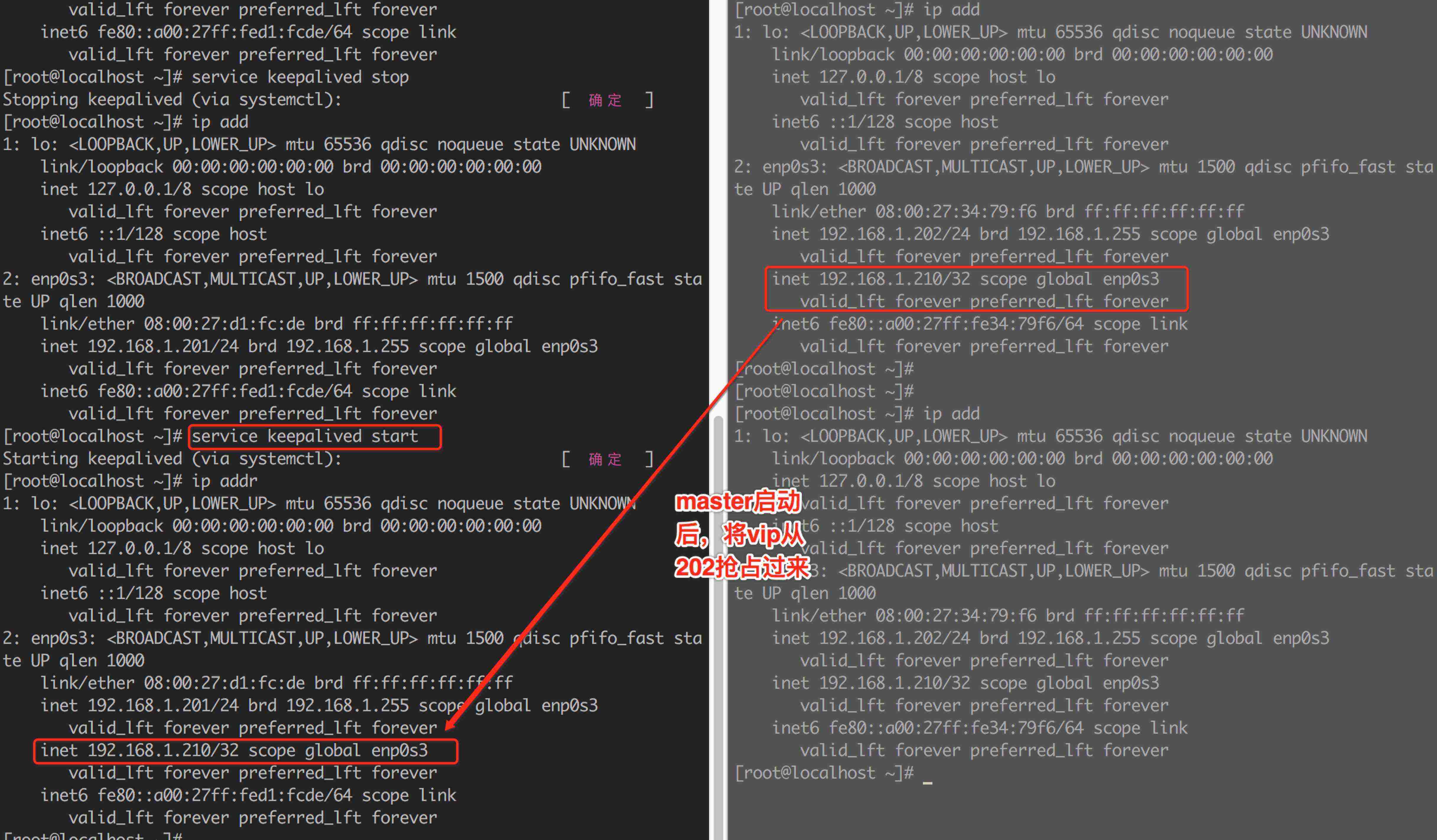 從上圖可以看出,vip已經(jīng)成功從201漂移到了202。此時再將201的keepalived服務(wù)啟動后,由于201是MASTER,所以會將202的VIP搶占過來。