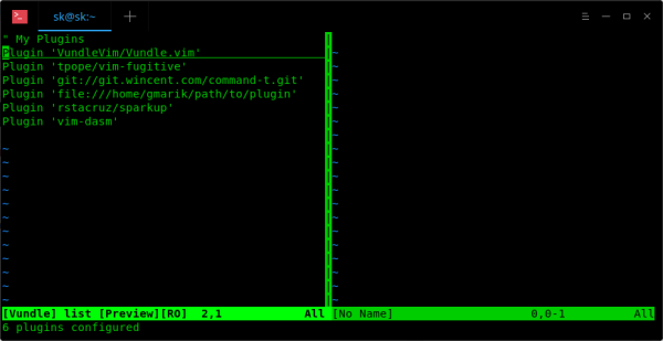 被標記為 “required” 的行是 Vundle 的所需配置。其余行僅是一些例子。如果你不想安裝那些特定的插件,可以移除它們。完成后,鍵入 :wq 保存退出。