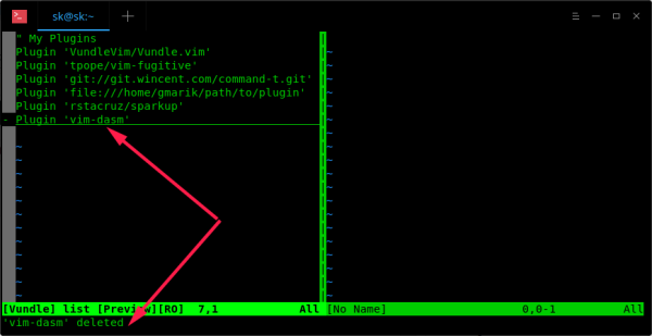 或者,你可以通過移除插件所在 .vimrc 文件行,并且執(zhí)行下列命令,卸載插件: