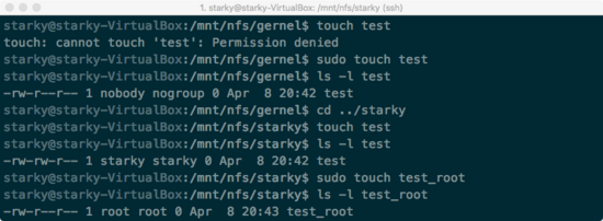 由于我在客戶端和服務(wù)端都有一個(gè)名為 starky 的用戶,且它們的 UID:GID 都為1000:1000,所以服務(wù)端的 /home/starky 目錄可以直接被客戶端的 starky 用戶訪問。且由于 no_root_squash 選項(xiàng),通過 sudo 命令創(chuàng)建的文件其屬主仍為 root(而不會(huì)再映射為 nobody)。