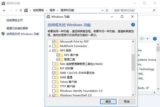 win10 系統(tǒng)默認(rèn)不能掛載 NFS 共享目錄,需要進(jìn)入 控制面板 - 程序 - 程序和功能 - 啟用或關(guān)閉 Windows 功能 ,勾選上 NFS 服務(wù) 。