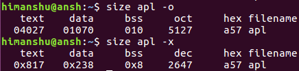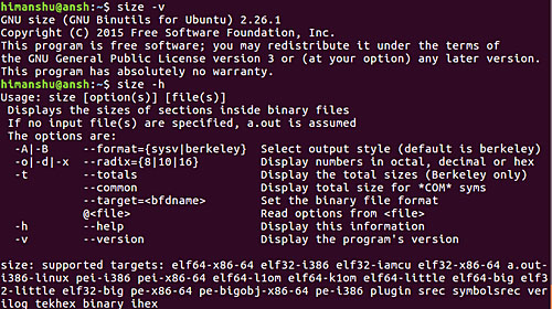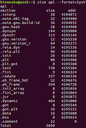 size 的基本用法很簡單。你只需要將目標文件/可執(zhí)行文件名稱作為輸入就行了。下面是一個例子: