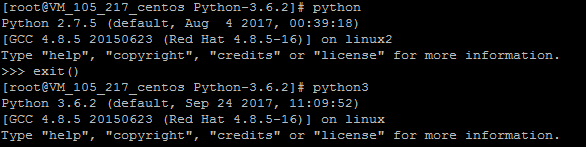 [root@VM_105_217_centos Python-3.6.2]# python Python 2.7.5 (default, Aug 4 2017, 00:39:18) [GCC 4.8.5 20150623 (Red Hat 4.8.5-16)] on linux2 Type "help", "copyright", "credits" or "license" for more information.