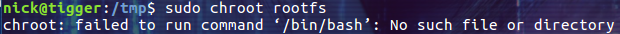 這次出錯(cuò)了,因?yàn)檎也坏?/bin/bash。我們知道 busybox 中是不包含 bash 的,但是 chroot 命令為什么會(huì)找 bash 命令呢? 原來(lái),如果不給 chroot 指定執(zhí)行的命令,默認(rèn)它會(huì)執(zhí)行 '${SHELL} -i',而我的系統(tǒng)中 ${SHELL} 為 /bin/bash。