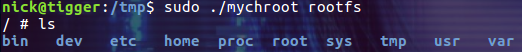 特別之處是我們的 mychroot 在沒(méi)有傳遞命令的情況下執(zhí)行了 /bin/sh,原因當(dāng)然是為了支持我們的 busybox 工具集,筆者在代碼中 hardcode 了默認(rèn)的 shell: