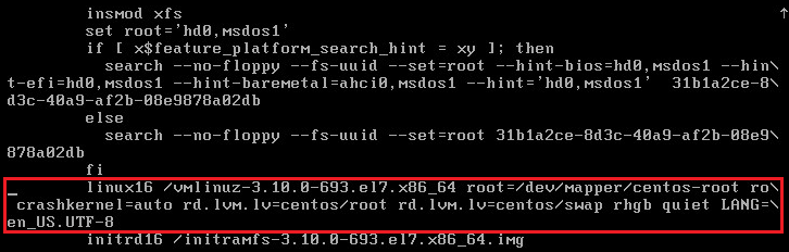 找到以 "linux16 /vmlinuz-" 開(kāi)頭的行。如果默認(rèn)沒(méi)有看到該行,需要按向下鍵把它滾動(dòng)出來(lái)。