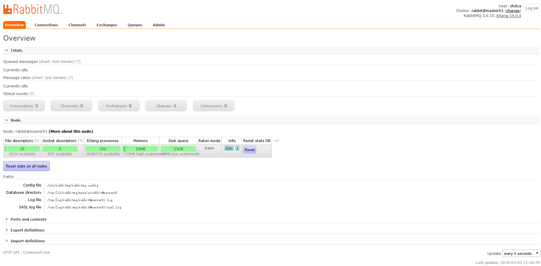 $ less /var/log/rabbitmq/rabbit\@master01.log =INFO REPORT==== 5-Mar-2018::21:42:07 === Starting RabbitMQ 3.6.10 on Erlang 19.0.4 Copyright (C) 2007-2017 Pivotal Software, Inc. Licensed under the MPL. See http://www.rabbitmq.com/ =INFO REPORT==== 5-Mar-2018::21:42:07 === node : rabbit@master01 home dir : /var/lib/rabbitmq config file(s) : /etc/rabbitmq/rabbitmq.config (not found) cookie hash : +9loSJmR5x/9GEguoed28A== log : /var/log/rabbitmq/rabbit@master01.log sasl log : /var/log/rabbitmq/rabbit@master01-sasl.log database dir : /var/lib/rabbitmq/mnesia/rabbit@master01 =INFO REPORT==== 5-Mar-2018::21:42:09 === Memory limit set to 732MB of 1831MB total. =INFO REPORT==== 5-Mar-2018::21:42:09 === Enabling free disk space monitoring =INFO REPORT==== 5-Mar-2018::21:42:09 === Disk free limit set to 50MB =INFO REPORT==== 5-Mar-2018::21:42:09 === Limiting to approx 924 file handles (829 sockets) =INFO REPORT==== 5-Mar-2018::21:42:09 === FHC read buffering: OFF =INFO REPORT==== 5-Mar-2018::21:42:07 === Starting RabbitMQ 3.6.10 on Erlang 19.0.4 Copyright (C) 2007-2017 Pivotal Software, Inc. Licensed under the MPL. See http://www.rabbitmq.com/ =INFO REPORT==== 5-Mar-2018::21:42:07 === node : rabbit@master01 home dir : /var/lib/rabbitmq config file(s) : /etc/rabbitmq/rabbitmq.config (not found) cookie hash : +9loSJmR5x/9GEguoed28A== log : /var/log/rabbitmq/rabbit@master01.log sasl log : /var/log/rabbitmq/rabbit@master01-sasl.log database dir : /var/lib/rabbitmq/mnesia/rabbit@master01 =INFO REPORT==== 5-Mar-2018::21:42:09 === Memory limit set to 732MB of 1831MB total. =INFO REPORT==== 5-Mar-2018::21:42:09 === Enabling free disk space monitoring =INFO REPORT==== 5-Mar-2018::21:42:09 === Disk free limit set to 50MB =INFO REPORT==== 5-Mar-2018::21:42:09 === Limiting to approx 924 file handles (829 sockets) =INFO REPORT==== 5-Mar-2018::21:42:09 === FHC read buffering: OFF FHC write buffering: ON =INFO REPORT==== 5-Mar-2018::21:42:09 === Database directory at /var/lib/rabbitmq/mnesia/rabbit@master01 is empty. Initialising from scratch... =INFO REPORT==== 5-Mar-2018::21:42:09 === Waiting for Mnesia tables for 30000 ms, 9 retries left =INFO REPORT==== 5-Mar-2018::21:42:09 === Waiting for Mnesia tables for 30000 ms, 9 retries left