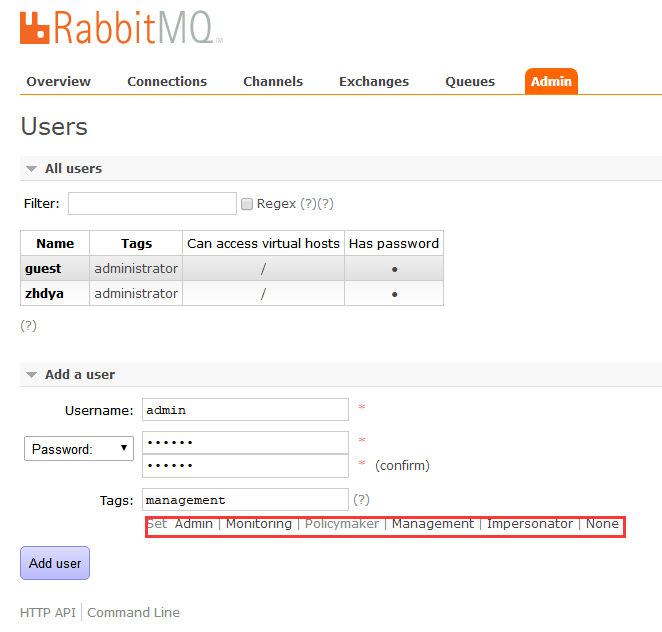 rabbitmqctl set_user_tags <username> <tag> $ rabbitmqctl set_user_tags zhdya administrator Setting tags for user "zhdya" to [administrator]
