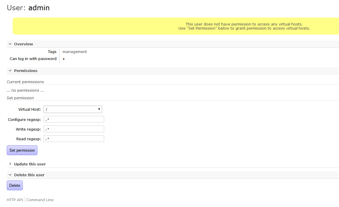 $ rabbitmqctl set_permissions -p "/" zhdya ".*" ".*" ".*" Setting permissions for user "zhdya" in vhost "/"