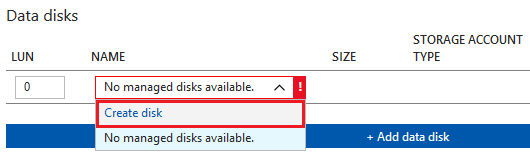 好的,終于進(jìn)入正題了! 在虛機(jī)的 disks 配置中點(diǎn)擊 "Add data disk" 按鈕開始添加磁盤,然后打開下拉列表并點(diǎn)擊 "Create disk" 按鈕: