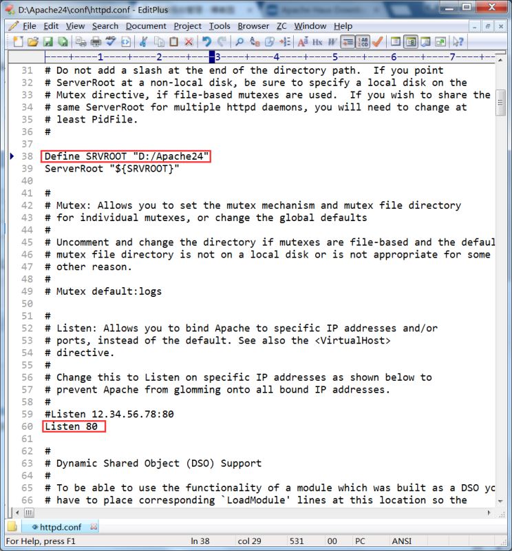 2、解壓后名稱為Apache24(可自定義),打開找到conf目錄,進入找到配置文件httpd.conf打開,更改服務(wù)路徑及端口,配置如下: