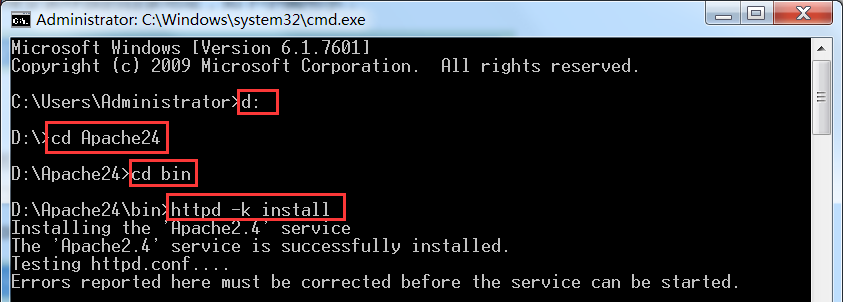 3、保存配置,打開CMD窗口,進入服務(wù)bin目錄,輸入安裝命令(httpd -k install)開始安裝服務(wù),如下圖所示: