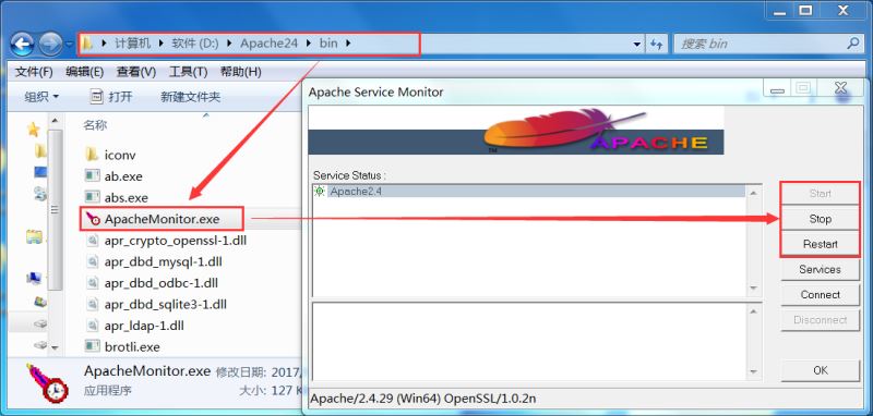 補充:除了上述啟動方式,也可以通過Apache自帶的管理窗口進行啟動和關(guān)閉,效果如下圖所示: