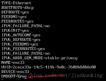 編輯ifcfg-ens33文件的最后一行,將ONBOOT=no改為ONBOOT=yes,,如下圖: