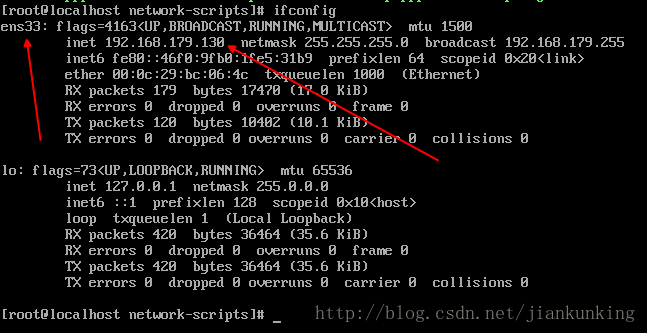 找到網(wǎng)卡配置文件名,這個網(wǎng)卡配置文件可以通過ifconfig命令查看,如下圖,我虛擬機的網(wǎng)卡名稱為ens33