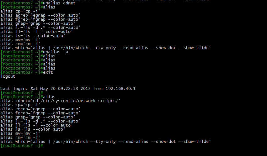 還有如果你需要取消一個(gè)別名,或者說不想要這個(gè)別名了,可以用unalias這個(gè)命令來刪除,比如我們剛創(chuàng)的別名,我不想要了,可以輸入unalias加上你想要?jiǎng)h除的別名,unalias cdnet然后確定,這個(gè)你剛剛創(chuàng)的那個(gè)別名就沒了,你可以在輸入alias來查看,還有一個(gè)命令是刪除所有別名,unalias -a這個(gè)命令就是刪除所有的別名。當(dāng)然這個(gè)刪除肯定也只是臨時(shí)刪除,如果你退出了,就恢復(fù)了,如果真的想刪除掉,跟剛剛創(chuàng)建時(shí)一樣的,進(jìn)入nano .bashrc這個(gè)目錄,把你不想要的別名直接刪掉,然后保存,在退出來就沒有了。