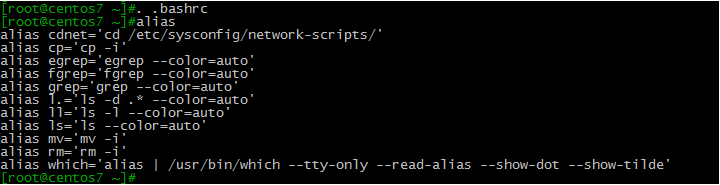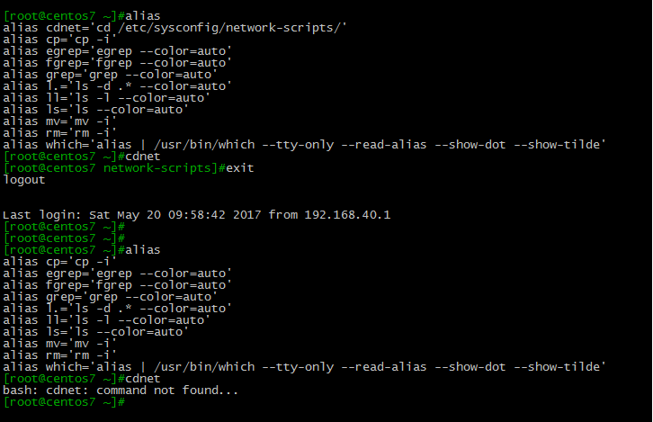 例如:我們經(jīng)常用的一個(gè)文件,cd /etc/sysconfig/network-scripts/ 這個(gè)命令就特別長(zhǎng),如果每次要進(jìn)入這個(gè)文件都要輸這么長(zhǎng),是不是很浪費(fèi)時(shí)間?那么我們可以給它定義一個(gè)別名,比如cdnet(當(dāng)然這個(gè)你可以自己選擇認(rèn)為好記得),當(dāng)然我們可以先檢查一下“cdnet”這個(gè)別名或者命令有沒有重復(fù),我們定義的別名最好不要跟系統(tǒng)已經(jīng)定義的別名和系統(tǒng)的一些命令起沖突,我們可以輸入你要設(shè)置的名稱,現(xiàn)在我要設(shè)置cdnet,你可以輸入cdnet然后回車,看下有沒有這個(gè)命令,提示說找不到這個(gè)命令,那么你就可以使用cdnet來定義這個(gè)別名,當(dāng)然我們也可以輸入命令“alias”,就可以看到我們已經(jīng)定義了哪些別名,以后我們添加的永久別名,也會(huì)保存在這個(gè)里面?,F(xiàn)在我們提示沒有cdnet這個(gè)命令或者別名,我們就可以使用這個(gè)用alias cdnet=‘cd /etc/sysconfig/network-scripts/'來給它建立別名,然后你在輸入cdnet,跟你輸入cd /etc/sysconfig/network-scripts/是完全相同的命令,這樣是不是方便多了?