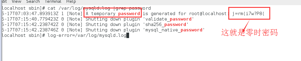 2.初始化后,會產(chǎn)生一個mysql的零時登錄密碼,那么在哪里查看呢?前面在my.cnf文件中配置的日志路徑是log-error=/var/log/mysqld.log,查看此路徑下面的mysqld.log日志,并且找到零時密碼