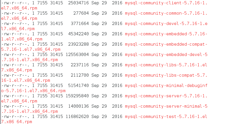 mysql-community-common-5.7.16-1.el7.x86_64 mysql-community-libs-5.7.16-1.el7.x86_64 mysql-community-client-5.7.16-1.el7.x86_64 mysql-community-server-5.7.16-1.el7.x86_64 mysql-community-devel-5.7.16-1.el7.x86_64