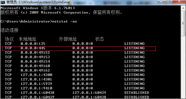 步驟2:在cmd命令窗口中輸入“netstat -an ”,查看445端口狀態(tài)。 如果445端口處于“listening”,則執(zhí)行“net stop server”暫時(shí)關(guān)停server服務(wù)。