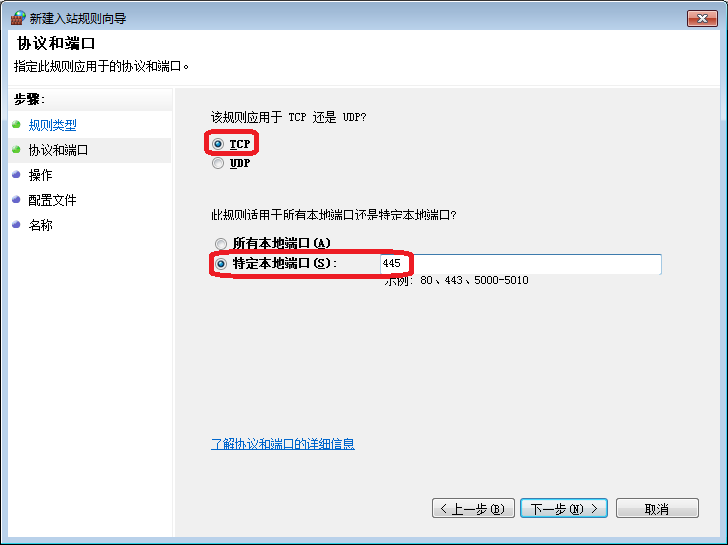 步驟4:在"新建入站規(guī)則向?qū)?quot;中配置"協(xié)議和端口 "。其中協(xié)議類型選擇TCP,適用端口設(shè)置為445,單擊"下一步"。