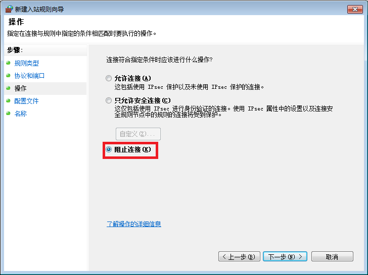 步驟5:在"新建入站規(guī)則向?qū)?quot;中配置 "操作",選擇"阻止連接"后單擊"下一步"。