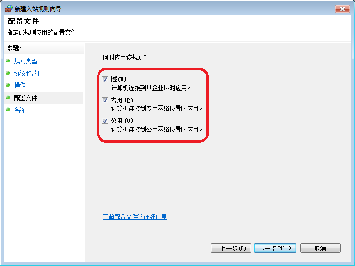 步驟6:在"新建入站規(guī)則向?qū)?quot;中配置 "配置文件",勾選所有選項(xiàng)后單擊"下一步"。
