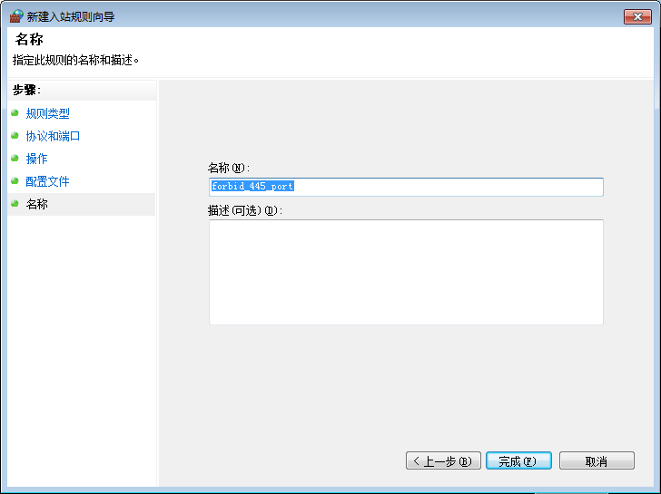 則向?qū)?quot;中配置"名稱",輸入新建規(guī)則的名稱后單擊"完成",即配置完畢。