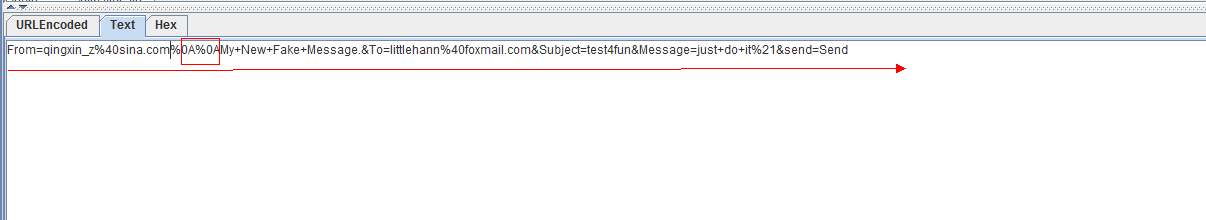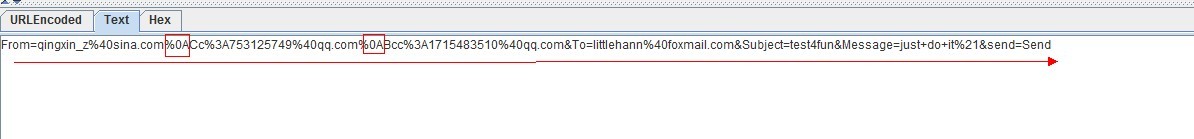 這里要注意的的,SMTP區(qū)分消息頭部和消息主題是依據(jù)%0A%0A雙換行符決定的。