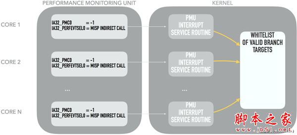 PMU是Intel引入的用于記錄處理器事件的功能單元。PMU事件有好幾百個,非常詳盡,包含了處理器在運行過程中可能遇到的所有情形,例如指令計數(shù)、浮點運算指令計數(shù)、L2緩存未命中的時鐘周期等。當然其中也有一個在HA-CFI中非常有用的事件,分支預測失敗事件。