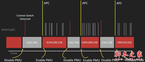 此外,為了進一步保證HA-CFI的效率,可以根據(jù)當前進程的重要性選擇性的開啟或關(guān)閉PMU,如當前進程為IE或Firefox瀏覽器時,開啟PMU;若當前進程為Calc.exe這樣不太容易遭受攻擊的進程,則關(guān)閉PMU,如圖所示:
