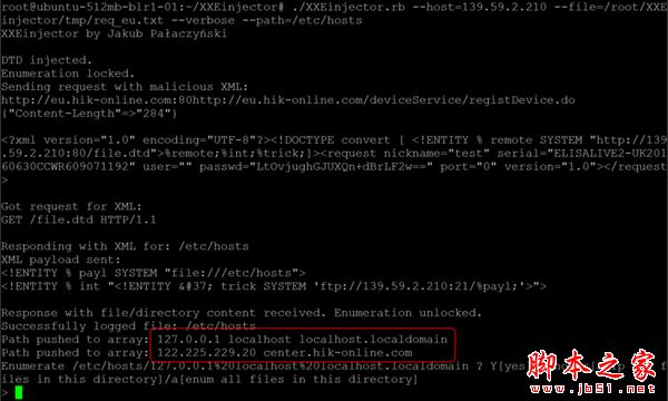 !這就有意思了,既然我們可以使用SYSTEM entity方式加載引用外部實(shí)體,就可以通過惡意dtd文件調(diào)用回傳其它網(wǎng)站文件,如/etc/hosts文件等。所有這些過程都可以通過一個(gè)好用的自動(dòng)化工具XXEinjector來完成:
