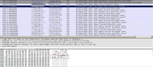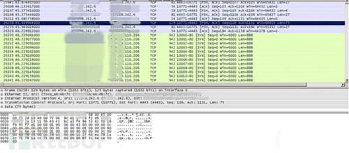 后續(xù)會(huì)進(jìn)行一段時(shí)間的相互通信,通過(guò)數(shù)據(jù)分析發(fā)現(xiàn),該通信包無(wú)明顯特征,應(yīng)該是為防止下斷recv,增加分析recv包的難度。經(jīng)過(guò)該段時(shí)間通信后,控制端會(huì)發(fā)送一個(gè)明顯突變的包,然后受控機(jī)開(kāi)始進(jìn)行向外DDoS攻擊。通過(guò)分析該包內(nèi)容,該包明顯相較于其他數(shù)據(jù)包不一樣,對(duì)比隨后就發(fā)生的DDoS攻擊的目的IP地址,發(fā)現(xiàn)該包包含了DDoS攻擊目標(biāo)IP與端口號(hào),因此可判斷為該包為指令包,如圖3所示。