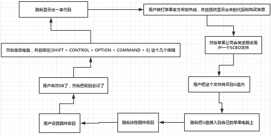 凡是密碼,都有忘記的可能性。蘋果公司為了預(yù)防用戶忘記自己設(shè)置的固件密碼,制作出一套嚴(yán)格的流程讓用戶可以重置之前設(shè)置的固件密碼。