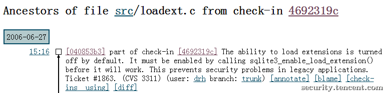 也許是SQLite官方也意識到了load_extension API的能力過于強(qiáng)大,在放出load_extension功能后僅20天,就在代碼中(http://www.sqlite.org/cgi/src/info/4692319ccf28b0eb)將load_extension的功能設(shè)置為默認(rèn)關(guān)閉,需要在代碼中通過sqlite3_enable_load_extensionAPI顯式打開后方可使用,而此API無法在SQL語句中調(diào)用,斷絕了利用SQL注入打開的可能性。