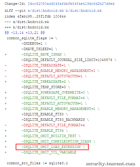 湊巧的是,出于功能和優(yōu)化的原因,Google從 Android 4.1.2開始通過預(yù)編譯宏SQLITE_OMIT_LOAD_EXTENSION,從代碼上直接移除了SQLite動(dòng)態(tài)加載擴(kuò)展的能力(如圖4)。