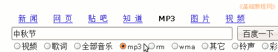 5)音樂搜索的方法也類似,開始先選中“MP3”,輸入關鍵詞,還可以在下面點音樂格式,然后再點搜索按鈕;