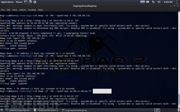 特別是–spoof-MAC選項使您能夠從一個特定的供應商選擇一個MAC地址,選擇一個隨機的MAC地址,或者設定您所選擇的特定MAC地址。 MAC地址欺騙的另一個優(yōu)點是,你讓你的掃描隱蔽,因為你的實際MAC地址就不會出現在防火墻的日志文件。