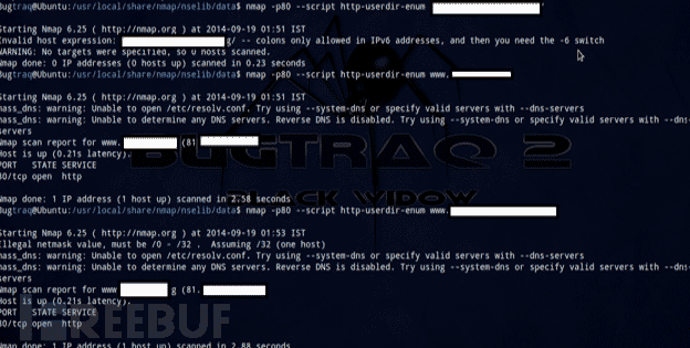 Apache的模塊UserDir提供了通過使用URI語法/~username/來訪問用戶目錄的方法。我們可以使用Nmap進行字典攻擊,確定web服務器上有效的用戶名列表。命令如下:nmap -p80 –script http-userdir-enum <target>
