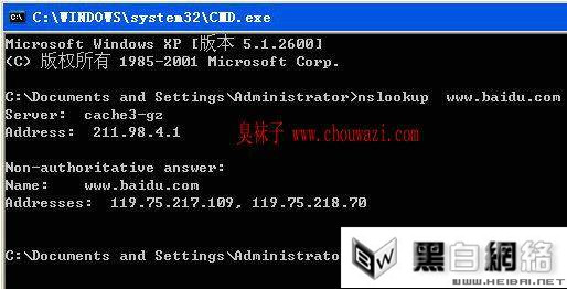 例如:nslookup www.baidu.com