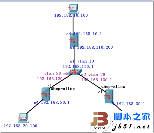 例:本實驗采用華為三臺F100防火墻,和一臺s3526交換機(jī),實現(xiàn)ipsec野蠻模式下的vpn通道的建立。Fw1是總部,實現(xiàn)fw1可以與fw2的內(nèi)部網(wǎng)絡(luò)互訪,fw1和fw3的內(nèi)部網(wǎng)絡(luò)互訪。fw2和fw3通過DHCP服務(wù)器動態(tài)獲取地址。